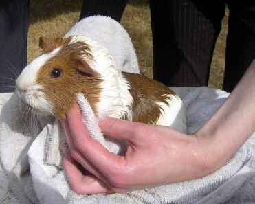 Tomar su conejillo de Indias y séquela bien. Después de eso tomar un paño húmedo y limpie su cara. Después que les peine y puso su guarro en el cuenta con jaula. Pero asegúrese de que la jaula esté limpia, porque entonces el baño sería inútil.