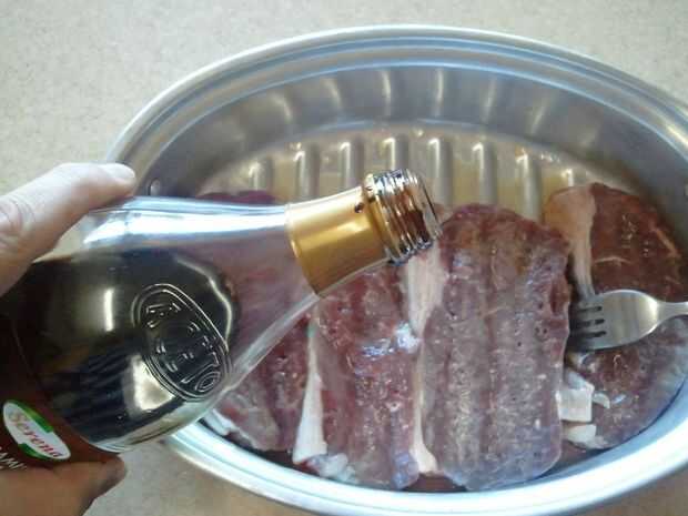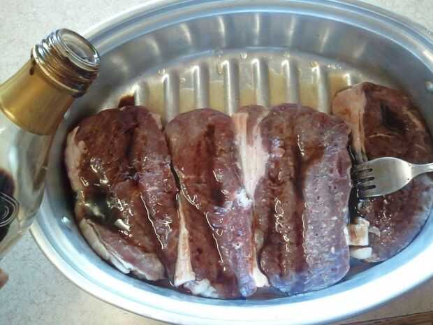El jugo de piña y vinagre balsámico son ligeramente ácidos y esto es lo que suaviza y ablanda la carne. El "ácido" ayuda a descomponer la estructura de la carne. Hará cualquier jugo de fruta ácida o líquido, incluso el jugo de limón funciona bien. Su muy natural y hace que el sabor de la carne maravillosa. No lo deje en mucho tiempo o incluso podría curar la carne. La horquilla crea los agujeros para el jugo de piña y el vinagre balsámico en y penetrar más profundamente en la carne donde se necesita más. Estoy usando jugo de piña por una razón específica, que más tarde nos pondremos.
