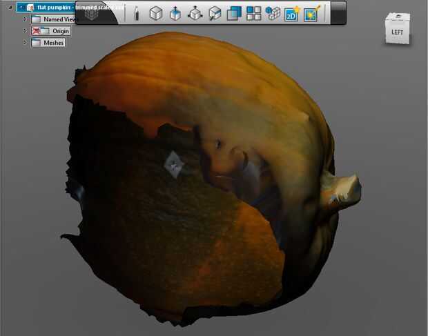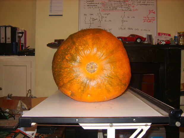 Como era en un cronograma muy estricto, me quedé con aplicación de CAD de un competidor que más conozco. Muchos paquetes de CAD 3D son capaces de trabajar de una manera similar. Usé los orificios de referencia en la malla en combinación con fotos para alinear el acoplamiento en el espacio 3D. La calabaza real era plana por un lado, que para colocarlo. Esto resultó muy útil para la alineación en la cama de la máquina más tarde.