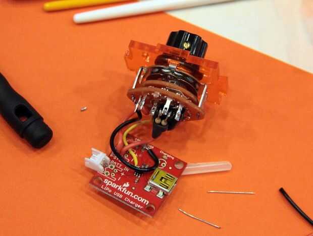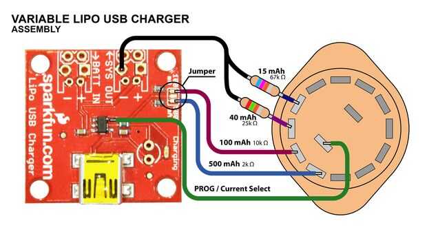 En el corazón del cargador es un chip de MCP73831T que cuenta con un controlador de administración de carga integrado. El valor de un resistor conectado al actual Reglamento conjunto perno del chip (PROG) dice el chip Qué tasa debe cargar. El circuito original para este kit tiene una resistencia de Ohm k 2 para recargar a 500mA y un 10k de 100mAh. En este proyecto el puente previamente acondicionado en el tablero de circuito está rayado, y se añaden resistencias k 25 k y 67. Un interruptor de 2 polos 6 posiciones y unos cables de puente permiten la resistencia de su elección para ser conectado a masa y así el índice de carga.