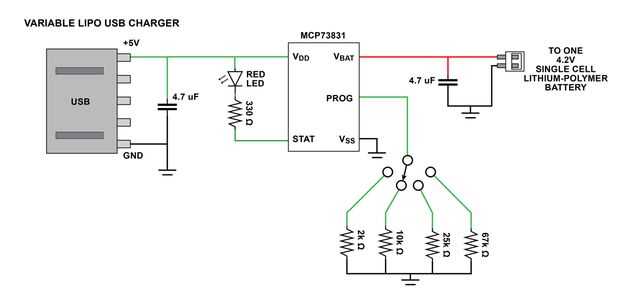 Si desea saber cómo se calcularon estos valores o más información sobre lo que estos chips, echar un vistazo a la hoja de datos de MCP73831T adjunto a esta página. Son un componente cool y se utilizan en los teléfonos, reproductores de mp3 y otros pequeños adornos recargables USB que encendida mientras carga. Esa es una de las mejores características de fichas, puede dejar su circuito conectado a la batería mientras se está cargando. Recarga USB es super conveniente por lo que estoy pensando de solo integrar el circuito en mis futuros proyectos portátiles.