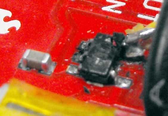 Primero quitar el quemado hacia fuera la viruta y había limpiado las huellas lo mejor que pude con un soldador y un cepillo de dientes dedicado electrónica. El cobre remonta donde un desastre, sino una rescatable. Recolocan los rastros que habían levantado con las pinzas y añadido unos toques de soldadura para las pastillas. Un nuevo chip fue colocado cuidadosamente sobre las almohadillas, y un toque rápido con la Plancha soldada su conduce hasta lo que quedaba de la huella, todos excepto uno. Dobló el pin PROG hasta de la Junta para hacer un cable nuevo, más delgado más fácil.