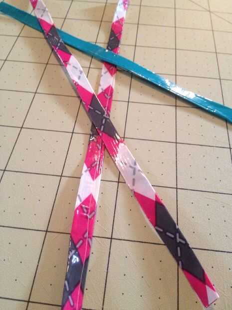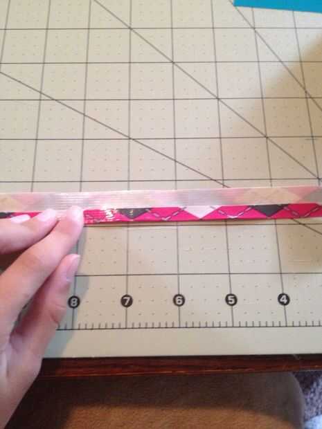 Ahora configure todas tus franjas poco al lado y tome una de sus tiras más largas y coloque el lado pegajoso hacia arriba y dóblalo por la mitad luego doblar el resto del pegajoso por lo que hay no más pegajoso que muestra. Para ello a las otras dos tiras.