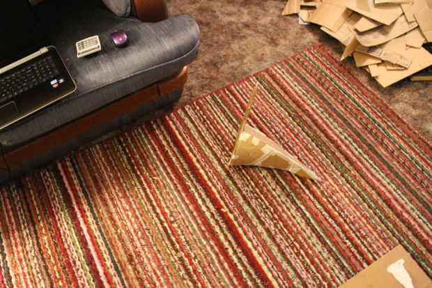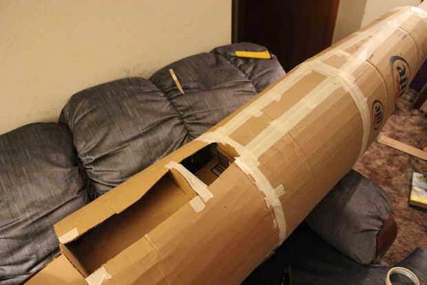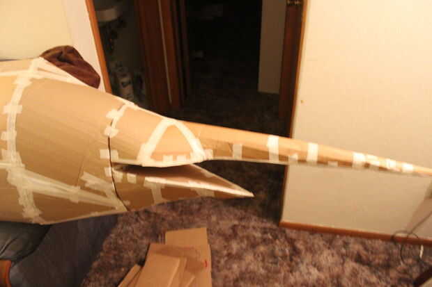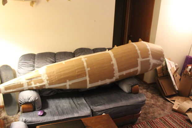 Que cubre el cuerpo es bastante sencillo. Usé cartulina acanalada, rodando un montón de las piezas en primer lugar su 'grano' por lo que curva fácilmente. Yo entonces improvisó piezas como un rompecabezas en el armazón, corte a medida con mi cuchillo y encintado de las piezas en con cinta de enmascarar. Las piezas más utilizas, saldrá mejor la forma, pero puedes ver que todavía se utilizan algunas piezas bastante grandes. Huecos ni agujeros que usted consigue, sólo cinta sobre y pone tiras extras si usted piensa que necesitan. Porque mi cuerpo no es un oval liso, tuve que hacer más secciones a lo largo de la parte superior. (por lo tanto, la brecha en los cuadros) Tenga en cuenta que todo el cuerpo conseguir una cubierta de papel maché, así que incluso si la cinta se parece un poco endeble el periódico hará esto.