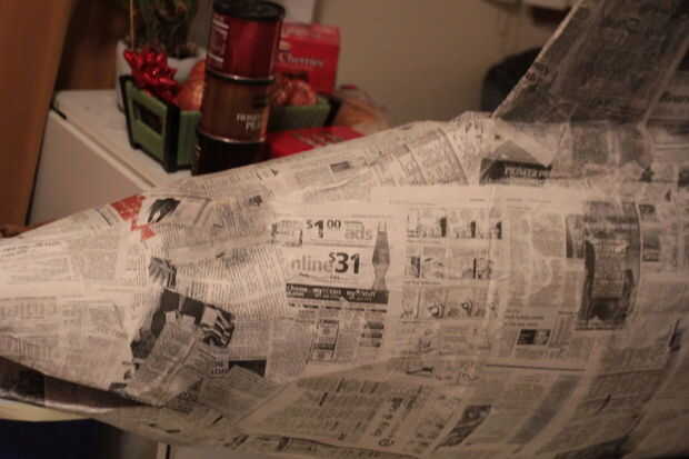 La cola: Hice la cola al igual que las aletas laterales, pero con cartulina extra en ambos lados para que sea simétrica. Después envuelve con la cinta y el papel mache, me corte una ranura de Veritas en el extremo de la cola del cuerpo y sólo la empujó en. Abundante cantidad de enmascaramiento forma cónica se añadieron luego tanto forma al cuerpo y mantener en su lugar, seguido por papel maché sobre todo esto.