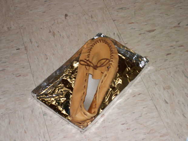 De su rollo de papel de aluminio, rasgue apagado dos cubre unos 15" de largo.  Luego apilarlos uno encima del otro y rodar el filo sobre un par de veces, hacer los rollos de 1/2".  Doblar los bordes hasta forma una bandeja un poco más grande que el mocasín.