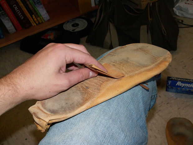 Con el papel de lija de grano grueso, lije hasta los fondos de los mocasines un poco.  Habrá algún polvo de cuero, así que asegúrese de que usted lo limpie.  El punto de las marcas es darle a la rubberizer algo para agarrar a.