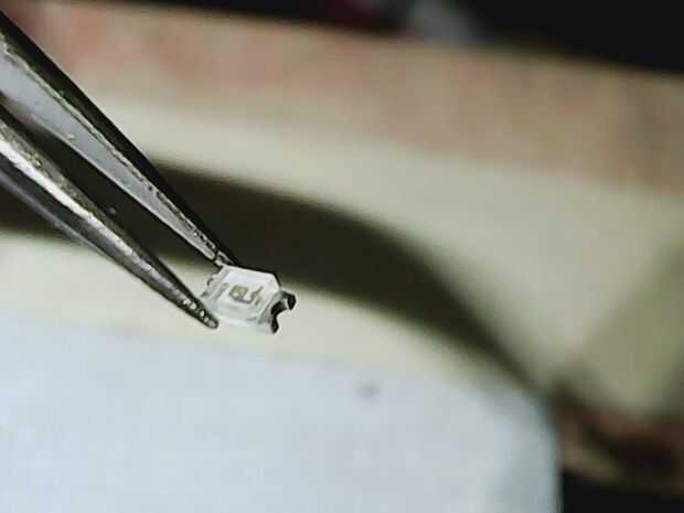 El proceso es básicamente sencillo. Tenemos que sostener un SMT LED boca abajo así podemos mano soldadura alambres a él. La mejor manera de hacer que el LED es unir a un pedazo de cinta adhesiva. Alambre magneto (30 calibrador) es probablemente el mejor tamaño para la mayoría de las aplicaciones. Si utilizas dos colores - uno rojo, otro verde, puede mostrar la polaridad del LED durante el montaje final. Si no utiliza dos colores, se necesita alguna otra manera para marcar la polaridad.