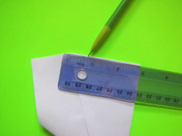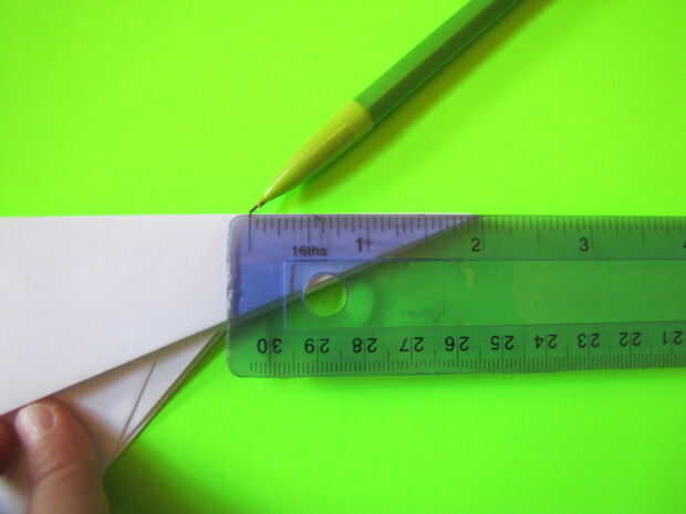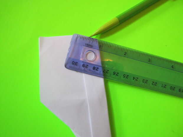 fold the plane in half along the centerline. 2 pulgadas desde la parte delantera de la marca y marca 3/4 pulgadas en la parte posterior. doblez de montaña entre las dos marcas, luego repita al otro lado (doble lavabo). marca de 3/8 de pulgada en la parte trasera superior del fuselaje. pliegue de esta marca a la parte delantera del avión a hacer 1 ala. Repita al otro lado.