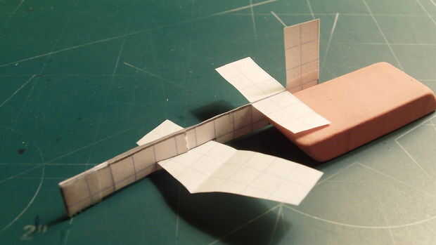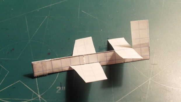 Ahora es el momento para trabajar con el ala de la Orion. Separar el fuselaje por el corte que hiciste. Después el ala a través del fuselage y tire de la mitad de él a través. Luego doblar las dos mitades a cada lado del fuselaje. Luego aplique un pequeño trozo de cinta en la parte inferior de las alas mientras que se doblan para arriba a ras con el fuselaje. Una vez hecho esto, se abaten las aletillas a lo largo de las marcas de media caja realizadas en los extremos del ala.