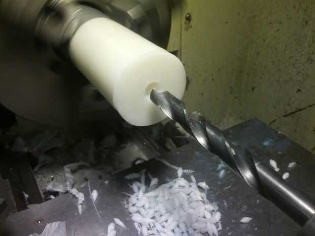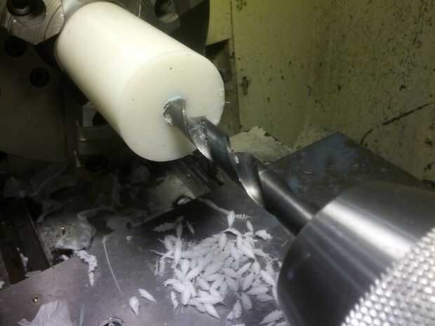Puede mantener la velocidad del torno bastante alta, 600 rpm está probablemente bien. Este material es suficientemente suave como para salir con eso, pero para brocas grandes de perforación en metal, usted querrá frenar.