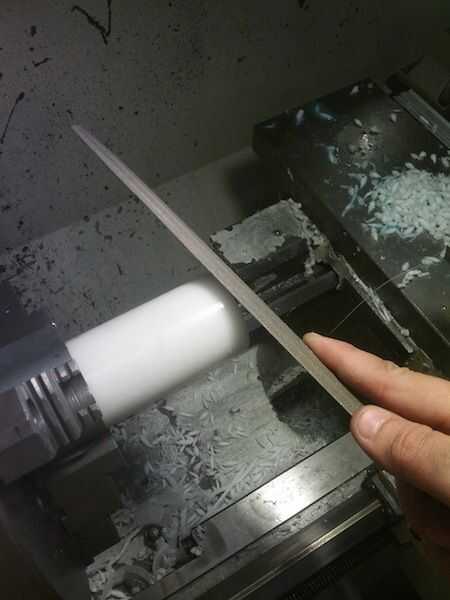 Straddle del mandril con los brazos y lentamente mover el archivo hacia adelante y hacia atrás sobre la esquina de la pieza (sólo estoy usando una mano en la foto pero eso es porque tenía que tomar la fotografía; usted debe usar las dos manos).