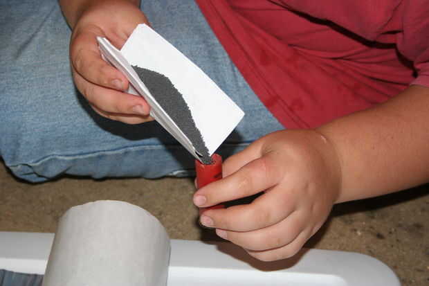 En este paso usted necesita doblar su pedazo de papel por la mitad y utilizar esto para verter el polvo negro. PRECAUCIÓN: Cuando verter polvo negro (o pyrodex) no Asegúrese de que ninguna fuente de ignición (calor extremo, electricidad estática, llamas, chispas, etc.) está presente.