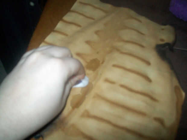 Ahora una vez que el papel esté seco lo saca del horno y colóquelo en el lugar. Conseguir que es vinagre de vino tinto y las bolas de algodón. Poner el vinagre donde quiera en el papel te gusta entonces dab apagado con la bola de algodón para darle un efecto más de la mancha.