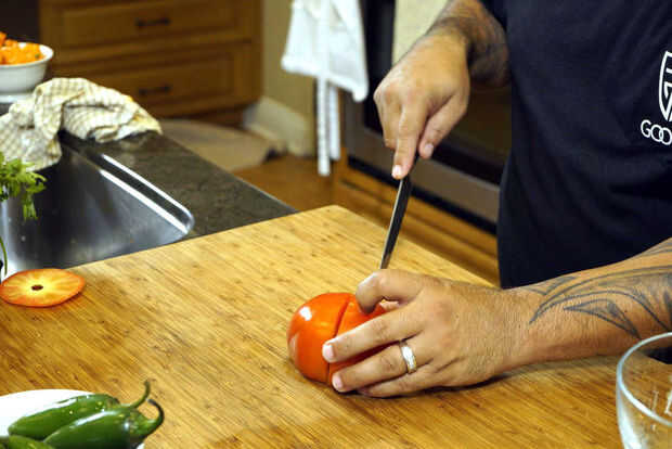 ingredientes:-4 tomates grandes maduros, sin semillas y picado-1/2 taza de cilantro, waashed y picadas-2 dientes de ajo-1 cebolla roja pequeña-1 cucharada de jugo de Lima fresco-caliente salsa (opcional)-2 o 3 pimientos-salPaso 1: Cortar los vegtable