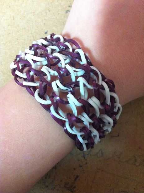 Paso 1: Obtener las herramientas Necesita su telar del arco iris, 2 colores de bandas de goma, un clip de c y un gancho.Paso 2: a partir de Una banda de goma en los dos pasadores de la torcedura. Y hacerlo otra vez con otra banda elástica.Paso 3:Gire