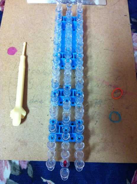 Paso 1: Obtener las herramientas Necesita su telar del arco iris, 2 colores de bandas de goma, un clip de c y un gancho.Paso 2: a partir de Una banda de goma en los dos pasadores de la torcedura. Y hacerlo otra vez con otra banda elástica.Paso 3:Gire