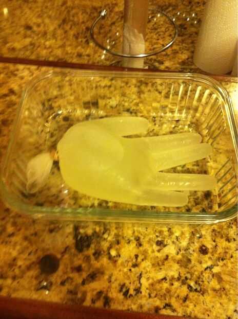 -Preparar una bandeja de horno poner la mano congelada en. -Llenar el guante con 1 1/2 tazas de agua tónica. -Quitar todo el aire del guante si es posible y ate con una goma.