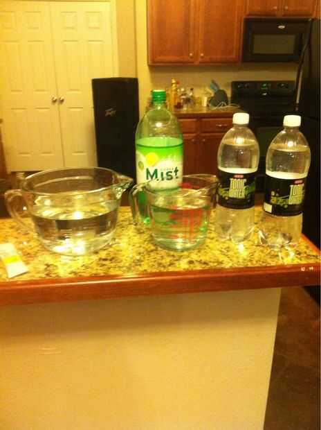 Medida en tazas de medición: 2L de agua tónica (las botellas vienen en envases de 1L, no es necesario medir estos) 2L de agua 1L de la niebla de la sierra