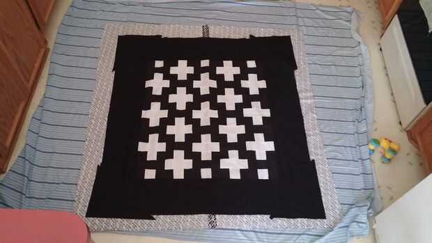 Listo hilvanado! Usted está listo para tejido de máquina el edredón! He encontrado este método extremadamente simple y eficaz. El spray adhesivo trabajó como se anuncia. Las piezas estuvieron limitadas juntos maravillosamente y sirvió bien mi propósito. El spray era sin olor, que era un plus. No tengo para nada y lo pude decir, el tejido no cambiar mientras que acolchado en mi pequeña máquina.