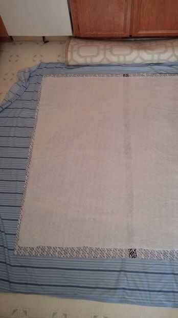 A continuación, haceos la cara superior del edredón en el bateo para colocarlo. Doblar por la mitad. Rocíe el spray adhesivo en el bateo y doblar suavemente la parte superior de la colcha en bateo. Suave marcha. Asegúrese de que no hay arrugas!