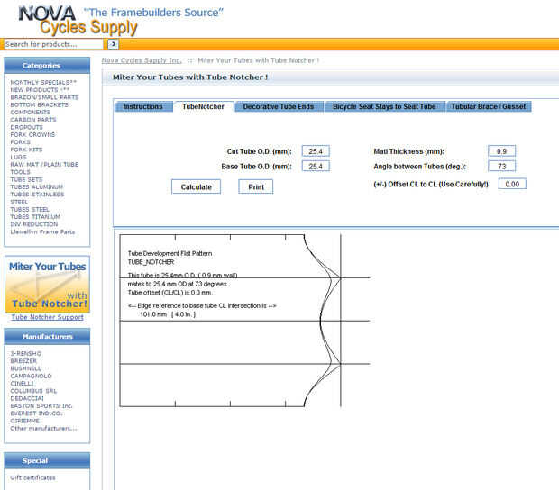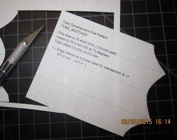 Utilizar un programa para generar un patrón de papel. Usar el tubo entallado programa en Nova ciclo de suministro. Me gusta este uno porque da una línea de referencia que es de 4 pulgadas de la línea central del tubo acoplamiento. Es útil al hacer a inglete tubos de una longitud específica. Otro programa puede encontrarse en MetalGeek.