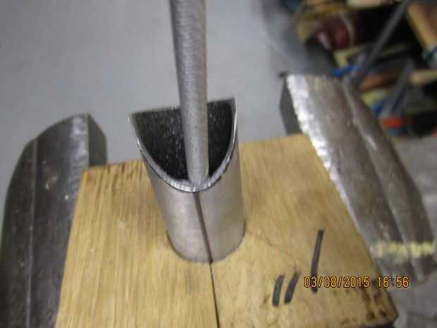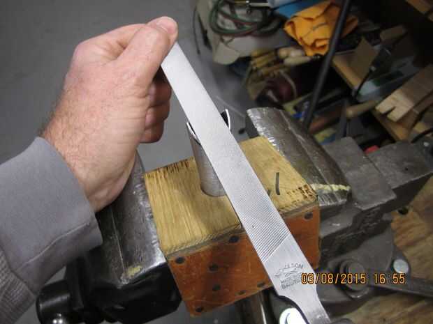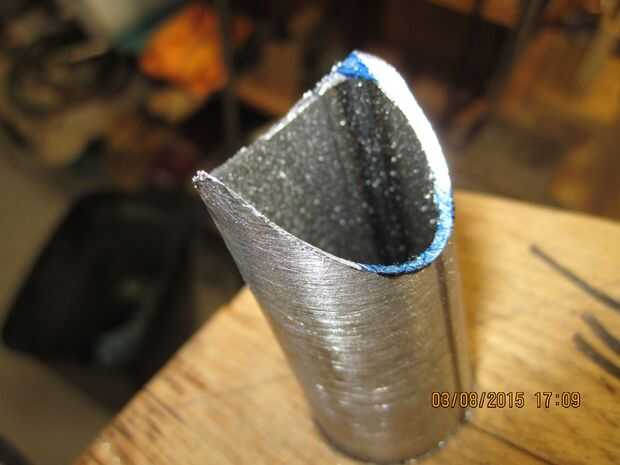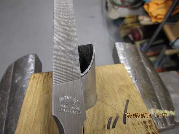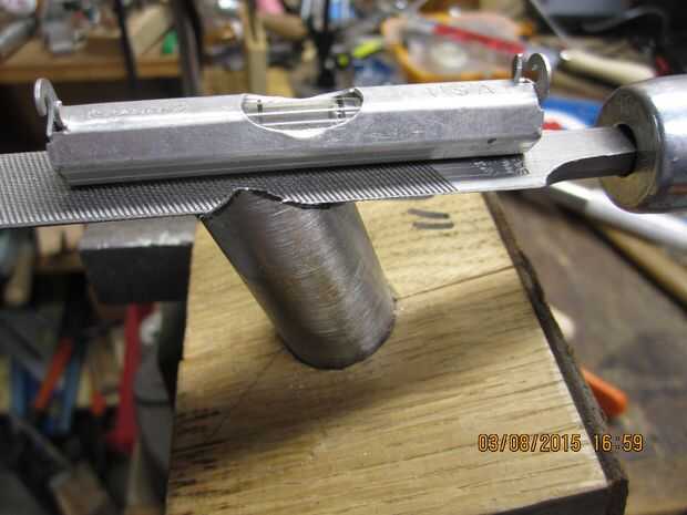 Verifique el ángulo del tubo usando el buscador de ángulo. Ahora use el tamaño correcto archivo casi hasta la marca. Cuando estás cerca puede empezar a comprobar para el ajuste. Un trozo de tubería del tamaño correcto debe quedar horizontal, marcada por el buscador de ángulo, con ninguna oscilación y debe tener contacto a lo largo de toda la longitud de la circunferencia de inglete. Además, para ingletes que ningún desplazamiento, orejas a ambos lados del corte deben ser la misma altura según lo medido por la Plaza.