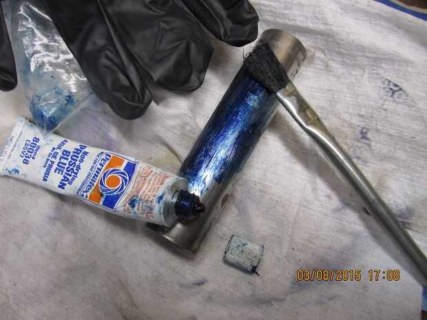 Puede ser útil al comenzar a tomar la probeta y aplicar algunos azulado. Colocar la probeta en el inglete, frótela alrededor y luego tomar distancia. Después de la prueba de la pieza se quita será fácil ver los puntos de contacto. Luego presentar a la azul. Es posible hacer ajustes precisos de esta manera. Con alguna experiencia, serás capaz de decir dónde están los puntos altos, meciendo la probeta. El punto de pivote de la mecedora es el punto alto. Y los puntos altos son siempre en alguna parte en los oídos. Ajuste final se logra frotando el archivo en un movimiento de rotación.