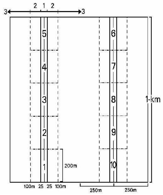 Si eres la primera persona a su plaza, tiene el privilegio de fijar las rutas para todos los 9even de futuras encuestas si su plaza es tomada por otro observador en el futuro). "Perfecto" transectos cruzar la plaza en una dirección norte-sur o en dirección este-oeste, 500m de distancia y 250m desde el borde de la Plaza (ver la primera imagen). cada transecto se divide en cinco secciones de 200m para fines de grabación.