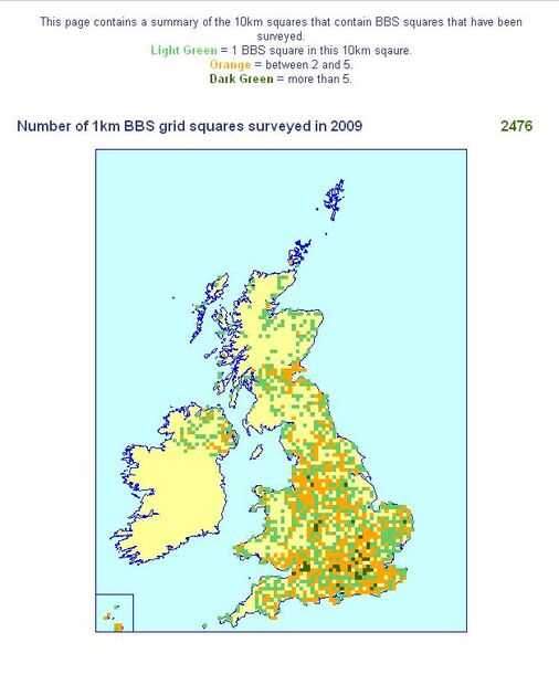 También puede seguir la difusión o disminución de especies individuales en una serie de mapas de animación. Algunas de las animaciones son bastante terribles, mostrando la enorme disminución en especies comunes de una vez. Otros son curiosos, como el Cuervo, que demostró un gran crecimiento y se separó en los años anteriores de la encuesta, seguido por un descenso. "¿Por qué?" es una de las preguntas de que la encuesta trata de responder.