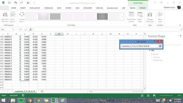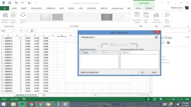 En primer lugar, en la pestaña 'Insertar' en la barra de herramientas Seleccione una trama de líneas 2D. Una vez que aparezca la trama en blanco, haga clic derecho en cualquier lugar en el área en blanco y haga clic en "Seleccionar datos". Otra ventana aparecerá para permitirle seleccionar los datos que va tramando. Haga clic en serie de agregar y seleccione los puntos de datos en la columna que contiene los datos del eje x (columna C en este ejemplo). Cuando haya terminado haga clic en 'Aceptar' y volver a la ventana Seleccionar origen de datos para editar los datos del eje Horizontal. Para hacer esto seleccione 'Editar' en la sección de 'Etiquetas del eje (categoría) Horizontal' y arrastre para seleccionar la columna que contiene los datos del sello de tiempo (se muestra aquí como columna A).