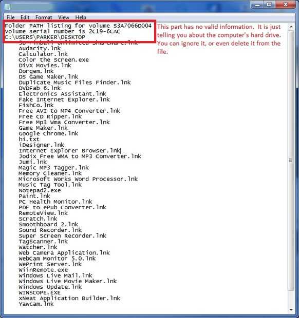 Haya terminado de crear el archivo. Desplácese hasta la ruta que elegiste en el paso anterior. En el ejemplo, fue C:\ pero tuyo podría estar en cualquier lugar en su computadora. Abrir el texto o archivo de Microsoft Word. Las primeras líneas de la pareja son inútiles y sólo hablan de su disco duro, pero el resto está lleno de información. Lo primero que notará es todo el fin de atajos en .ink. Esto es normal, y no hay mucho que usted puede hacer al respecto. Pero continuando, la lista de todo en el escritorio.