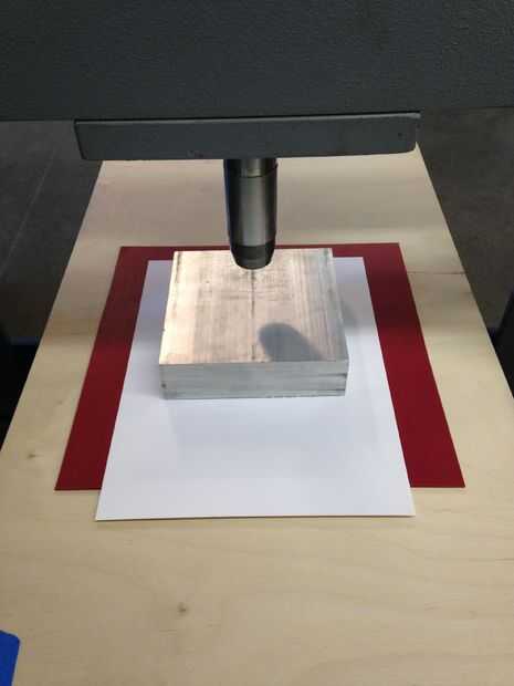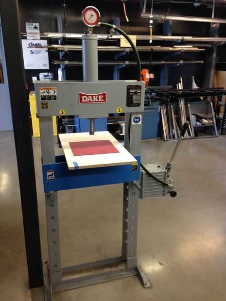Por último, configurar tu máquina y presiona su papel. Usé una prensa Dake de bomba mano, que me permitió aplicar manualmente la presión que necesitaba deboss. Encontré.5 tonelada presión mucho y repasando tendía a puro papel dejar marcas indeseables, rips, etc.. También coloqué una hoja de goma en el papel para permitir que los deboss para ocurrir. Yo origen # 100 acciones de cubierta blanco puro de francés Paper Co.
