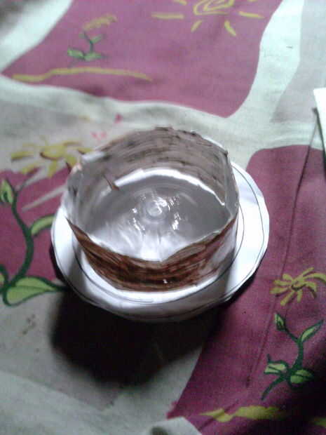 corta una botella por la mitad, utilizar la parte inferior y cubrir la parte externa con papel crepé o papel de construcción, seguro de la placa con cinta. su no ese necesario cubrir el fondo, ya que no se puede ver.