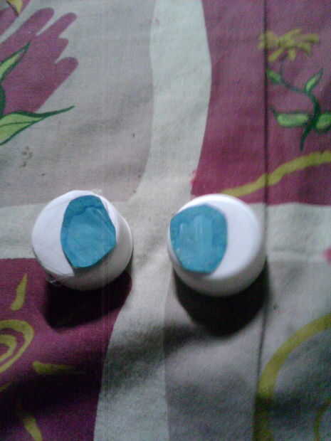 use papel de construcción azul si desea que en el segundo juego, y y amarillo para la primera. cortar óvalos o círculos y que se ajuste en los tapones de botellas. cinta adhesiva o pegamento a los casquillos para hacer los globos oculares.