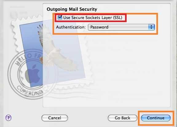 ** Si aparece la ventana "seguridad de correo saliente" , asegura que "SSL" está activaday el cuadro de autenticación se establece en "Password." ** después, haga clic en continuar**