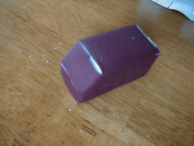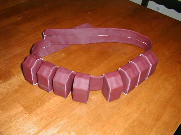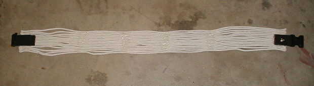La correa de la circunferencia se hace cortando un clothsline en longitudes iguales, pegar las cuerdas junto con una pistola de pegamento y luego pegar una hebilla a los extremos. El cinturón de la circunferencia entonces consigue una capa de pintura de Borgoña.