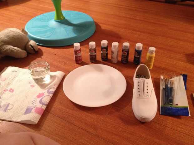 Primeras cosas primero: reunir los materiales. 1. pinturas. Asegúrese de que usar pinturas acrílicas para zapatos de lona! Yo utiliza blanco, negro, marrón, púrpura, rojo y amarillo. 2. pinceles de pintura. Volvió a conseguir un paquete de pinceles de acrílico por lo que usted tiene una variedad de cepillos para piezas de pintura diferentes. 3. agua y toallas de papel 4. Secador de pelo. Hace que puede secar más rápido la pintura una vez que Haz hecho con una sección o una capa. De lo contrario tienes que esperar unas horas antes de continuar. Llevé el secador de pelo a la pintura cada vez que he terminado un paso.