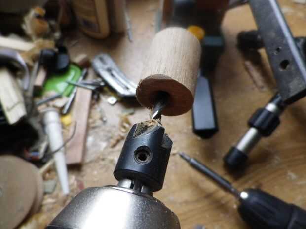 Coloqué mi carrete de soldadura en la espiga y marcado de donde cortar. Y luego perforó un agujero aunque como se muestra en la imagen y lo avellanado. Yo debo haber hecho esto en el anuncio de prensa de taladro/Pilar necesita una tonelada de fuerza que no tengo con el taladro inalámbrico especialmente como una madera dura y contrahilo.