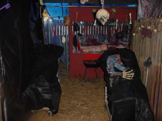 a pie entre 2 "cadáveres" mi hija cosida de telas de weedbarrier, un traje viejo era relleno y coloca en una, la otra tiene un par de almohadas. Las "camillas" de aluminio fueron recogidos en la basura unos años y por lo general deber hacer para llevar mi arte a y otros necesitan suministros a ferias de arte y tal