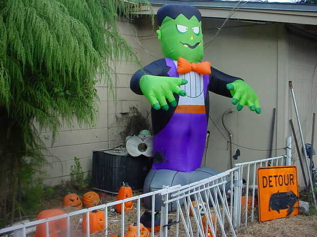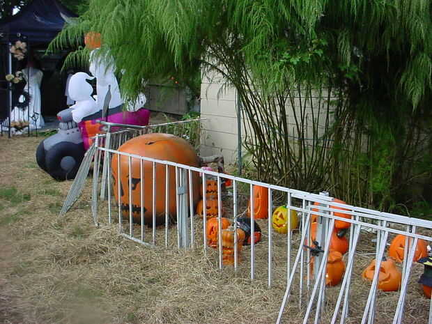 un par de neumáticos y un montón de calabazas iluminadas unen fuerzas con un viejo filtro de la piscina hemos pintado de naranja para hacer las calabazas grandes, la valla es más reciclado piezas de aluminio de una piscina, el mismo material fue utilizado para hacer el techo sobre el corto túnel oscuro que llevó a "Él", los tubos cuadrados son del mismo material que el techo de la cámara de tortura... Es la parte agradable sobre este material y el pvc puede guardar detrás de la caseta y no sufre con el tiempo
