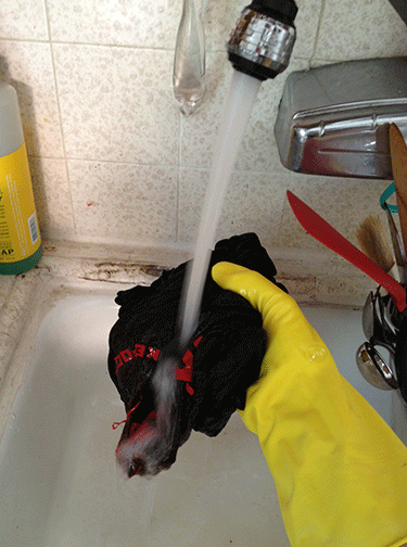 La camiseta no debe oler como bleach en absoluto en este punto, pero si lo hace, mantenga enjuagar con agua hasta que ya no huele a productos químicos.