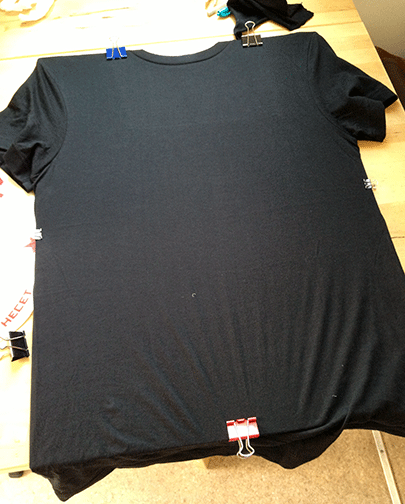 2. utilice ganchos de carpeta (o algo similar de clip y) a la parte delantera de la camiseta tirante alrededor de la Junta de estabilización. El objetivo aquí es crear una superficie menos elástica para intentar transferir el vinilo sobre y camisetas son elástico! Si la camiseta ya se estira bastante apretado en el tablero, no necesitará hacer esto.