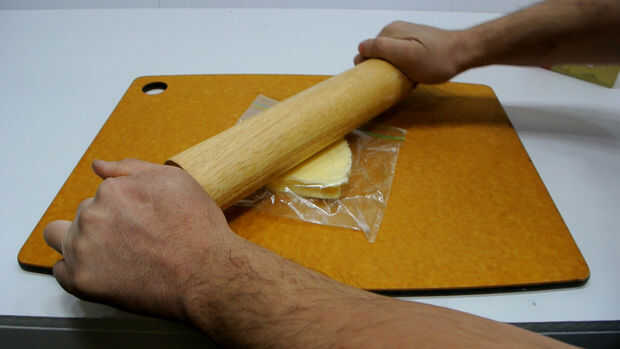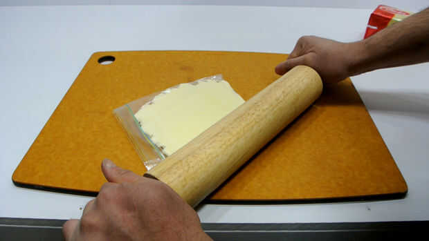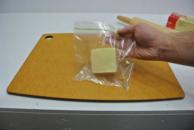 Poner la mantequilla fría en una bolsa o entre dos piezas de abrigo se aferran. Mientras que usted necesita, puede usar como mucho o como poco de mantequilla. He hecho esto con una libra de mantequilla y funciona muy bien.