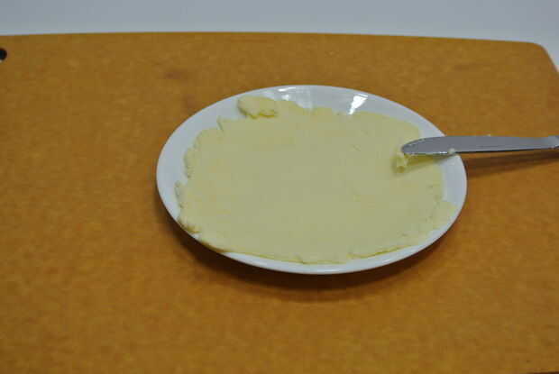 Hacerlo tan plano como sea posible, cuanto más se trabaja más rápido se ablandará. Tienes que quitar el plástico y poner en un plato como una vez la mantequilla caliente será difícil separar el plástico.