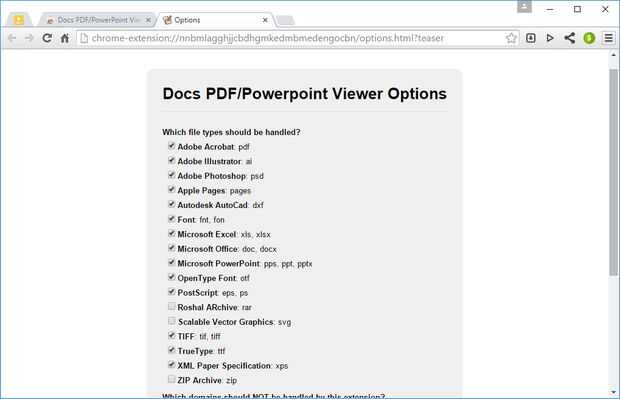 Después de instalar el plug-in, se te presentará una lista de extensiones de archivo que puede abrirse con dicho plug-in. Todos ellos se abrirá con Google Drive y no necesita una cuenta de Google para ello.