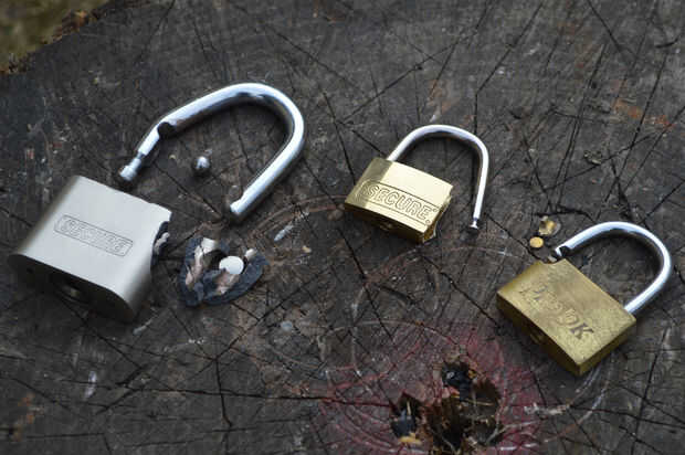 Se muestra cómo abrir una cerradura con dos llaves de combinación/llaves de tuerca grande. Este método de derivación cerraduras sólo funciona en cerraduras baratas hechas con materiales pobres. Destruirá también la cerradura doble grillete y rompiendo parte de la caja del cerrojo. Las llaves se insertan en el grillo de la cerradura y son ángulos alejados uno del otro. Los extremos de las llaves se llevan a cabo y luego se presionan hacia la otra. Las llaves se utilizan como palancas para el grillete que termina por romper el lado de la cerradura que estaba sosteniendo el grillo dentro de la cerradura de apertura.