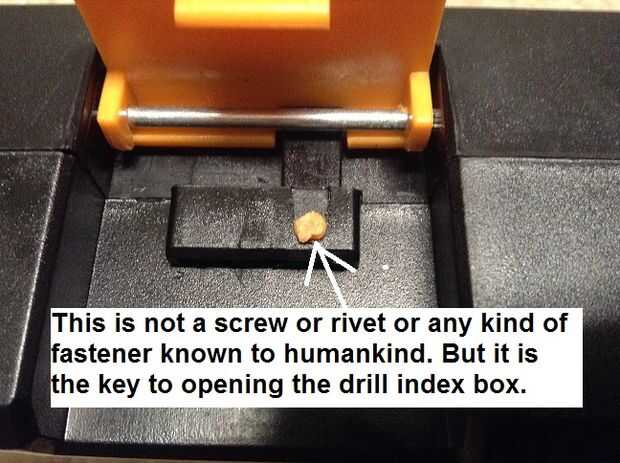 La pequeña cosa redonda amarillo allí está el secreto. Si usted puede averiguar cómo conseguir que fuera de allí, habrá abierto la caja. No es un tornillo, perno, remache o clavo. Es simplemente un pin de algún tipo que tiene una ranura que se expande ligeramente para sostener firmemente en el agujero.