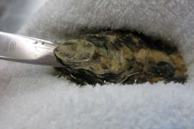 Con el lado plano de la ostra para arriba, mueva la punta de un cuchillo de la ostra en una abertura cerca de la bisagra. Sólo Inserte aproximadamente 1/4 de cualquier pulgada.