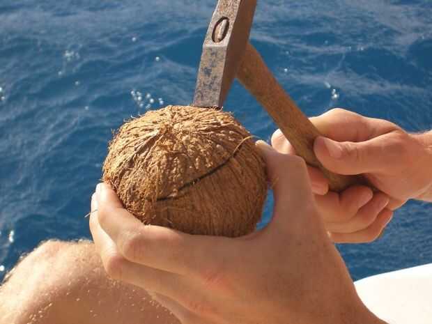 - Toma el coco pelado en una mano y el martillo en la otra.